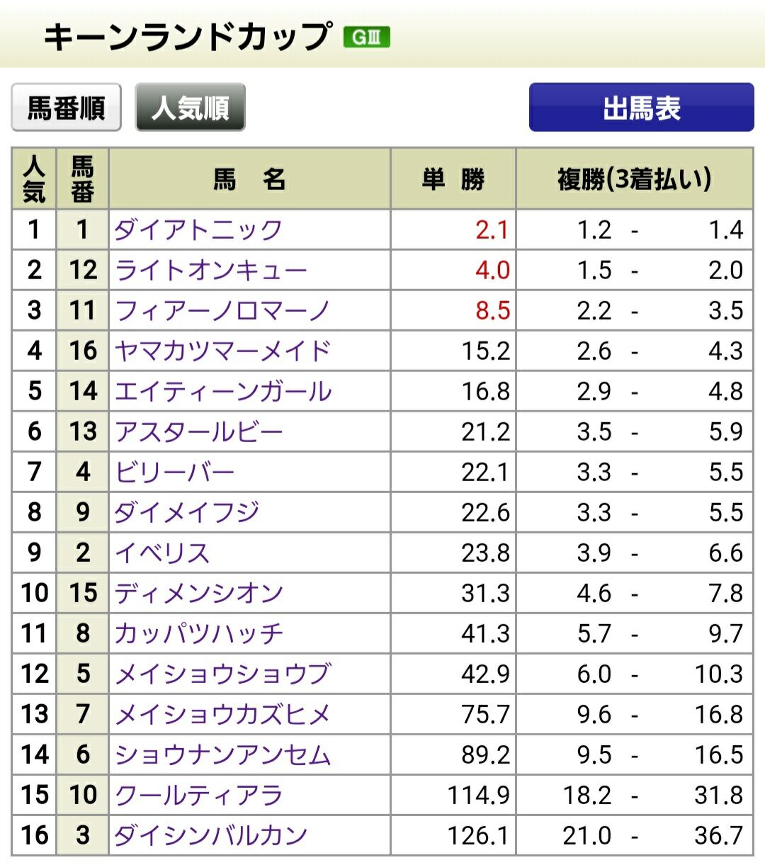 ◯01ダイアトニック(1人気)は15着。😰