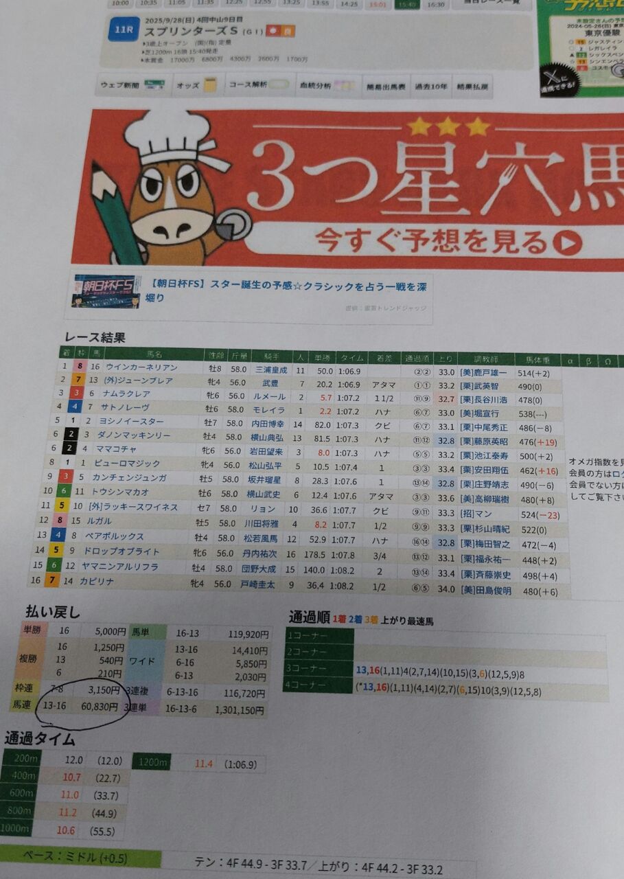 スプリンターズS。普通ならBOX買いをするのに、何でかこの時だけ変則BOX買いをしてしまい年間収支に関わる大チョンボ…。